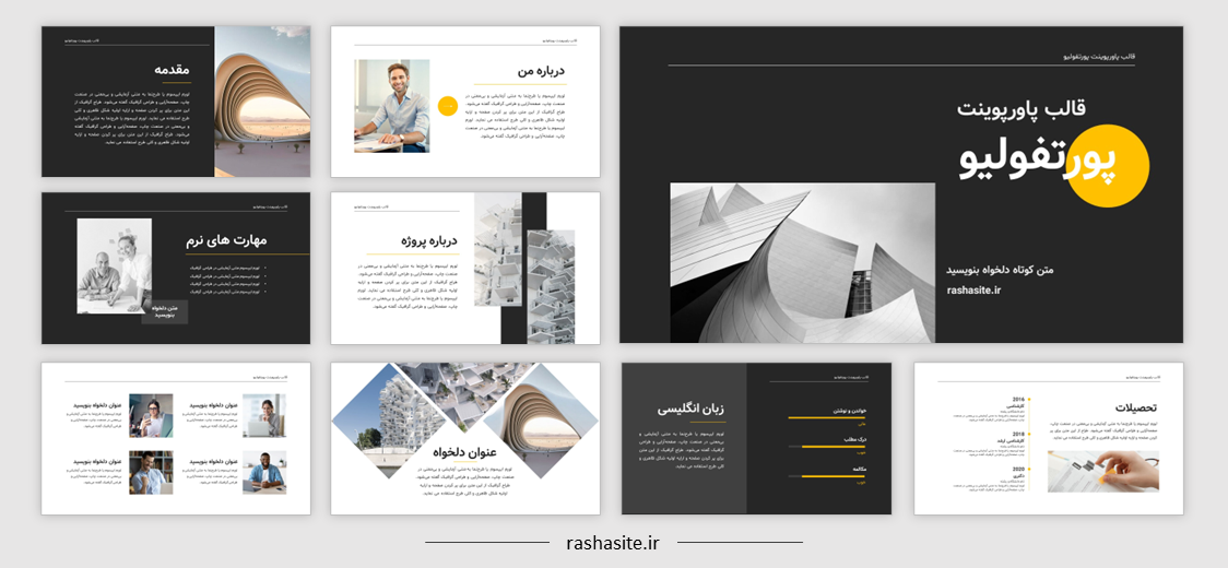 در تصاویر زیر می توانید یک نمونه قالب پاورپوینت دیگر را، که در آن ها از تصاویر با اشکال و فرم های خاص استفاده شده است، مشاهده نمایید. این قالب پاورپوینت را نیز می توانید از طریق سایت خریداری و دانلود نمایید.