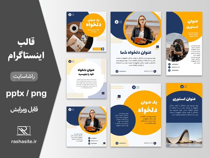 تمام تمپلیت های اینستاگرام راشاسایت به دو صورت قالب پست و استوری با فرمت پاورپوینت و همچنین قالب PNG (عکس شفاف و قابل ویرایش با پسوند png.) موجود می باشند.