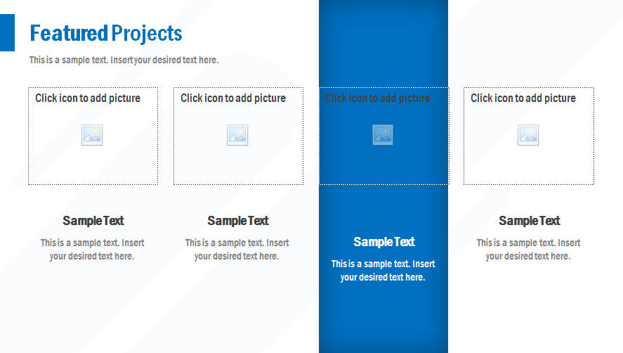 - در این قالب، اسلاید ها به گونه ای طراحی شده اند تا شما بتوانید تصاویر مورد نظر خود را به راحتی داخل اسلاید و در بخش مورد نظر قرار دهید. (placeholder) برای مثال در تصویر زیر، در مربع های مشخص شده، با کلیک در بخش “click icon to add pictures” می توانید به راحتی عکس مورد نظرتان را انتخاب و در آن قسمت قرار دهید.