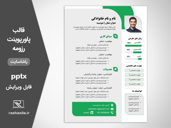 قالب رزومه کاری سبز یک فرم آماده رزومه با ابعاد A4 است که با پاورپوینت طراحی شده است و امکان ویرایش و شخصی سازی کامل تمام جزئیات طرح نیز با پاورپوینت امکان پذیر است. ساخت رزومه با این قالب بسیار آسان است و تنها کمی آشنایی پایه با محیط و ابزارهای پاورپوینت کفایت می کند. حتی امکان تغییر رنگ قالب و هر یک از بخش ها و اشکال به کار رفته در آن نیز به آسانی و با کلیک بر روی هرکدام قابل تغییر می باشد.