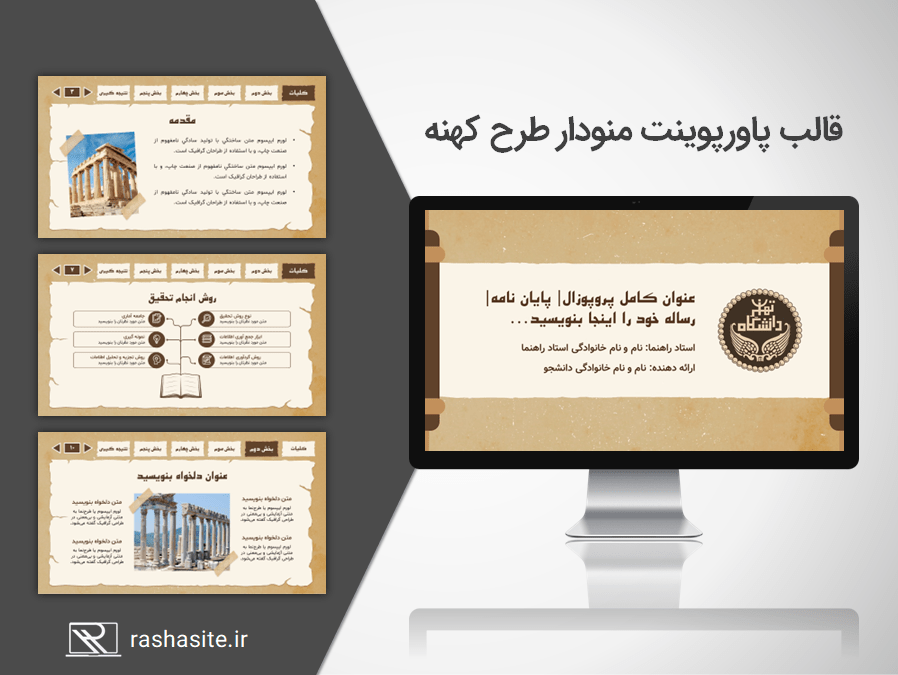 در صورتی که ارائه یا پایان نامه شما موضوعی مرتبط با تاریخ، باستان شناسی، هنرهای باستانی، نسخه های خطی، آثار قدیمی و موضوعاتی از این دست است، پیشنهاد می کنیم از این تم پاورپوینت پایان نامه طرح کهنه استفاده کنید.