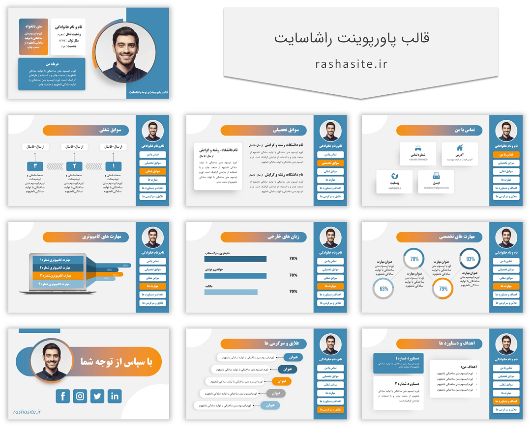 این قالب رزومه که مشخصات و تصاویر آن را در ادامه مشاهده می کنید، کاملا قابل ویرایش است. شما می توانید با جایگذاری متن ها و آیتم های دلخواه خودتان درون قالب، تغییر دادن رنگ ها، عکس، ویرایش عناوین و لینک های منوی سمت راست اسلاید ها و به طور کلی شخصی سازی تمام بخش های قالب، به سادگی و به سرعت یک پاورپوینت رزومه حرفه ای آماده کنید.